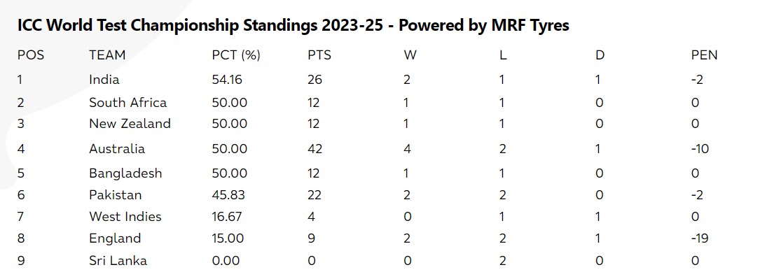 Jasprit Bumrah and Mohammed Siraj bagged eight and seven wickets respectively as the shortest-ever Test ended within five sessions within two days. Before the match, India were placed at the sixth spot in the standings.