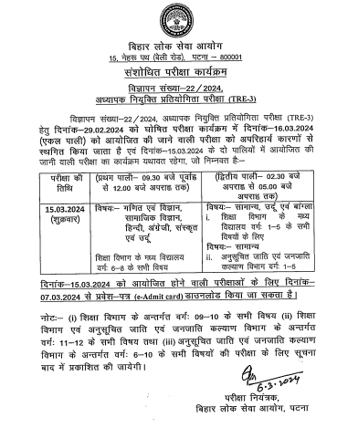 BPSC further stated that the exam set for March 15 will proceed as scheduled, with admit cards scheduled to be issued today, March 7, 2024. "The schedule of the examination, to be conducted in two shifts on March 15, 2024, will remain the same," reads the notice.