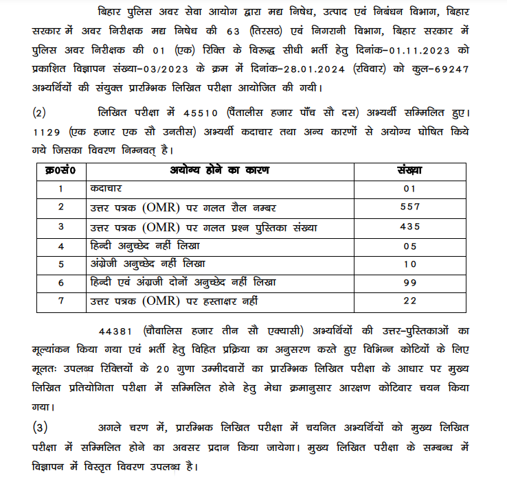 The SI Prelims exam was held on November 1, 2023, at various exam centers. As many as 45,510 applicants across all attended the exam, and 1,129 of them were disqualified for various reasons, including misconduct. The commission has issued the BPSSC SI Prelims 2023 Result in PDF format, in which candidates can check their roll number on the list.