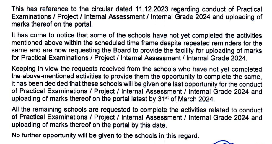 "Keeping in view the requests received from the schools who have not yet completed the above-mentioned activities to provide them the opportunity to complete the same, it has been decided that these schools will be given one last opportunity for the conduct of practical examinations / project / internal assessment / internal grade 2024 and uploading of marks thereof on the portal latest by 31st of March 2024," the board added.