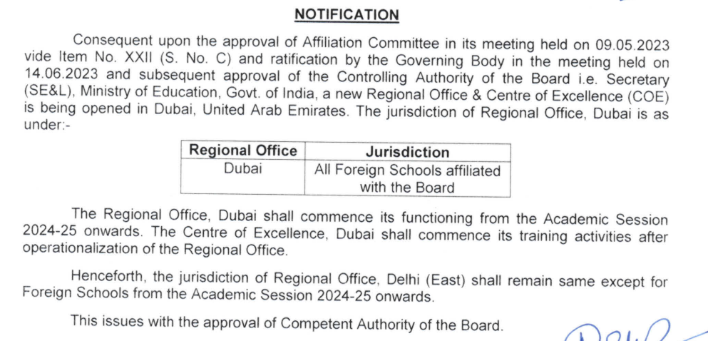 “Consequent upon the approval of affiliation committee in its meeting held on 9.05.2023 and ratification by the governing body in the meeting held on 14.06.2023 and subsequent approval of the controlling authority of the board i.e. secretary (SEandL), Ministry of Education, Govt of India, a new regional office and centre of excellence (CoE) is being opened in Dubai, United Arab Emirates,” reads the official notification.