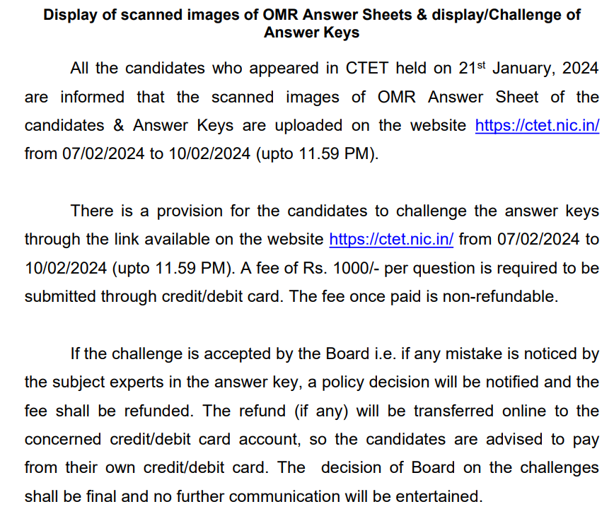 Applicants may file an objection, if any, to the CTET answer key 2024 between February 7 and February 10, 2024. Once the fee has been paid, it cannot be refunded. A credit or debit card payment of Rs 1000 per question is required.