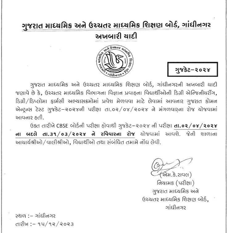 “As CBSE board exam is held on the said date, GUJCET - 2024 exam will be held on Sunday 31/03/2024 instead of 02/04/2024. This should be noted by school principals/guardians, students, and all concerned,” read the official notification.