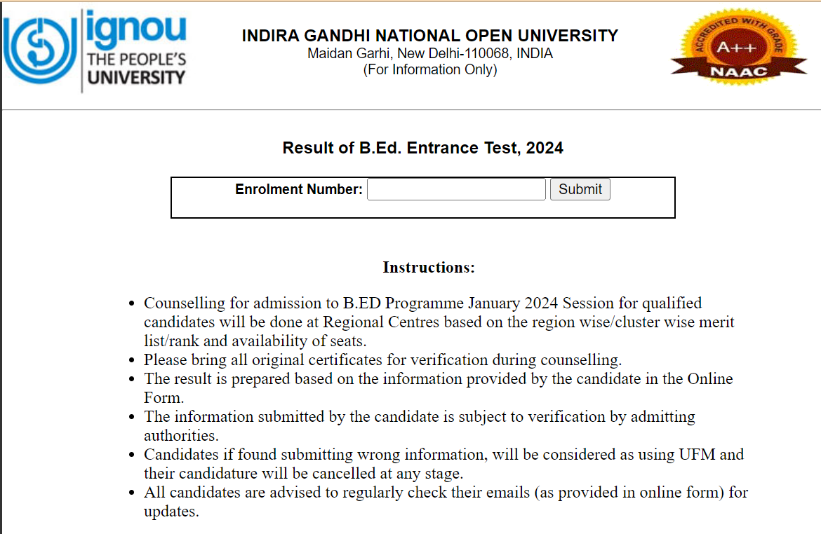 Step 5: Click on the submit button and the IGNOU BEd Entrance Exam 2024 Result will appear on the screen