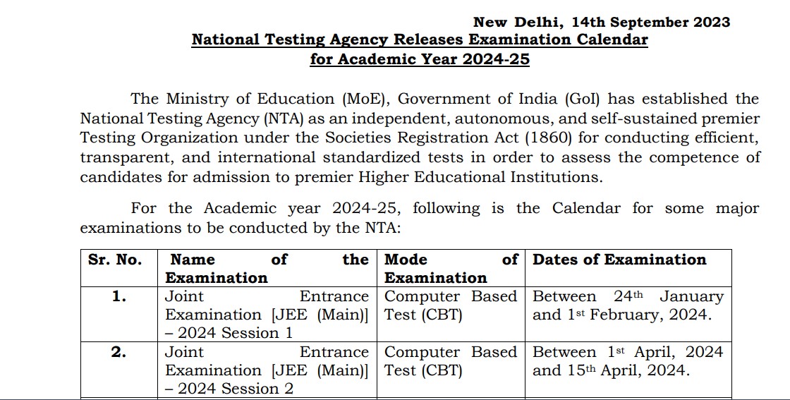 JEE Main 2024: The National Testing Agency on Tuesday released the JEE Main 2024 exam dates. The Joint Entrance Examination (JEE) Main 2024 will be conducted in two sessions. The first session will be held in January-February and the second session will be conducted in April. Candidates can check the JEE Main 2024 exam dates at nta.ac.in.