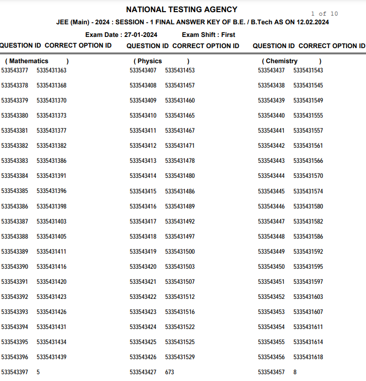 JEE Main 2024 Final Answer Key Available At jeemain.nta.ac.in