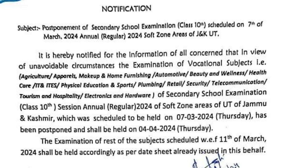 According to the notification, the JKBOSE class 10th examination for vocational subjects including Agriculture, Apparels, Makeup & Home Furnishing, Automotive, Beauty and Wellness, Health Care, IT & ITES, Physical Education & Sports, Plumbing, Retail, Security, Telecommunication, Tourism and Hospitality, and Electronics and Hardware has been rescheduled to take place on April 4, 2024. Earlier, the exam was set to be held on March 7, 2024.