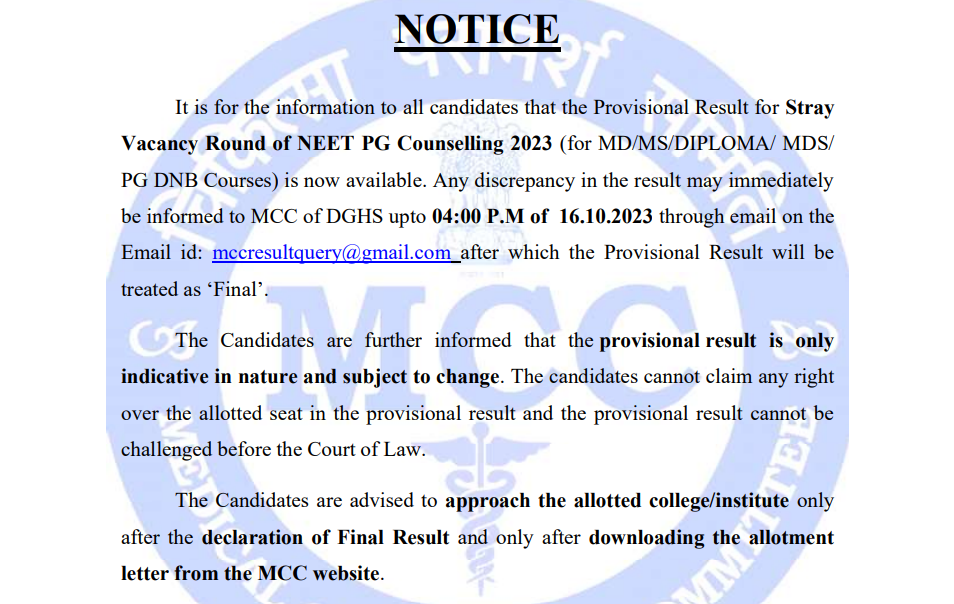 “It is for the information to all candidates that the Provisional Result for Stray Vacancy Round of NEET PG Counselling 2023 (for MD/MS/DIPLOMA/ MDS/ PG DNB Courses) is now available. Any discrepancy in the result may immediately be informed to MCC of DGHS upto 04:00 P.M of 16.10.2023 through email on the Email id: mccresultquery@gmail.com after which the Provisional Result will be treated as ‘Final’,” reads the official ntofication.