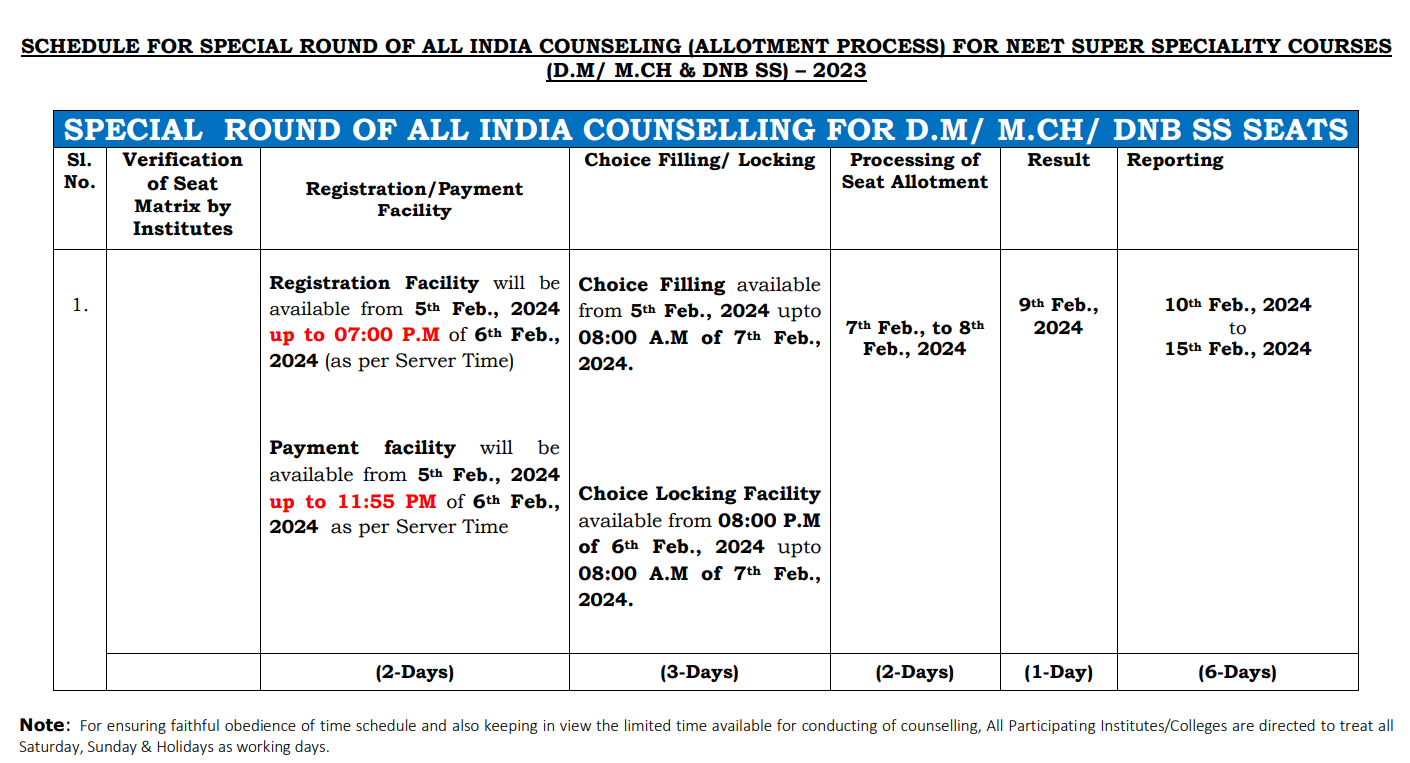 According to the schedule, the Committee is scheduled to conduct the choice-filling process from February 5 to February 7, 2024. The option to lock choices will be available from February 6 to February 7, 2024. Seat processing will take place from February 7 to 8, 2024. The NEET SS 2023 Counselling Special Round Result will be announced by MCC on February 9. Candidates who are selected can report to their allocated medical college between February 10 and February 15, 2024.