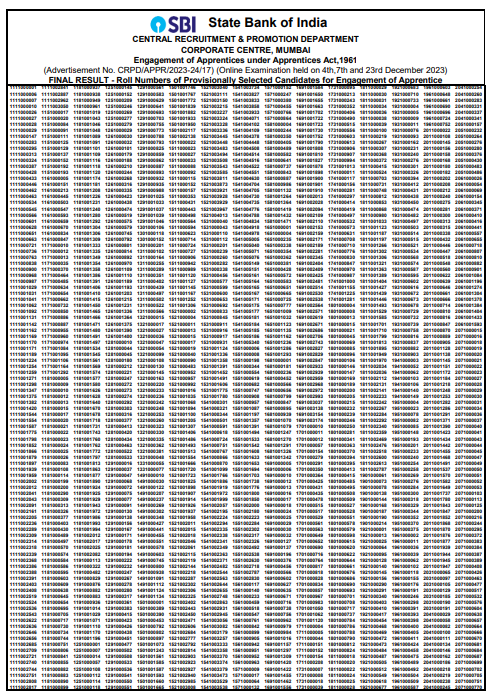 The SBI Apprentice results are accessible in PDF format, containing the roll numbers of provisionally selected candidates for apprentice engagement. These candidates are eligible for the Proficiency Test in Local Language(s).