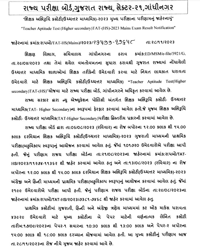According to the data, as many as 43,933 candidates registered for the TAT HS written exam. The Gujarat TAT HS Main exam was held in five zones at 243 centers spread across the state of Gujarat. Along with the Sebexam Gujarat TAT HS result, the board has also issued the Gujarat TAT Main merit list PDF on the official portal.