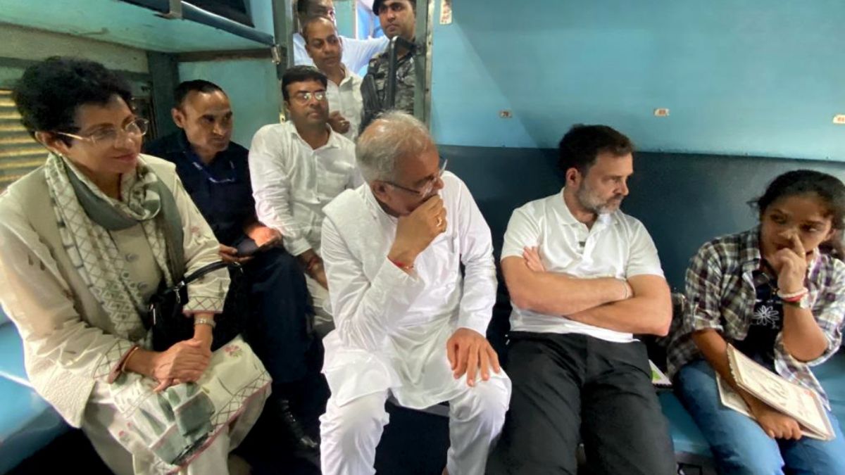 (Chief Minister Bhupesh Baghel with Congress Lok Sabha MP Rahul Gandhi during a train ride from Bilaspur to Raipur during the latter's visit to Chhattisgarh on Monday.Pic credits: ANI)