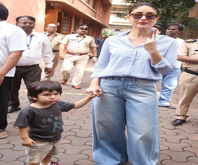 3:40 pm: Bollywood actor Kareena Kapoor Khan poses for a photograph with her son Taimur Ali Khan after casting her vote
