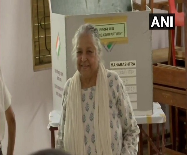 7:49 am: Mumbai: Actress Shubha Khote after casting her vote for the Andheri West constituency.