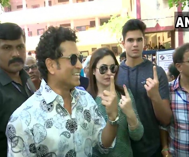 12:25 pm: Sachin Tendulkar, wife Anjali and their son Arjun after casting their vote at a polling booth in Bandra (West).