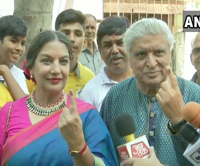2:18 pm: Shabana Azmi and Javed Akhtar after casting their vote at a polling booth in Mumbai