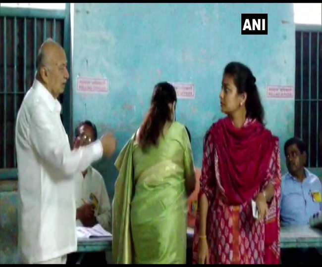9:50 am: Former Home Minister and Congress leader Sushilkumar Shinde with wife Ujwala and daughter Praniti Shinde cast their votes at a polling booth in Solapur. Praniti Shinde is contesting elections as a Congress candidate from Solapur Central.