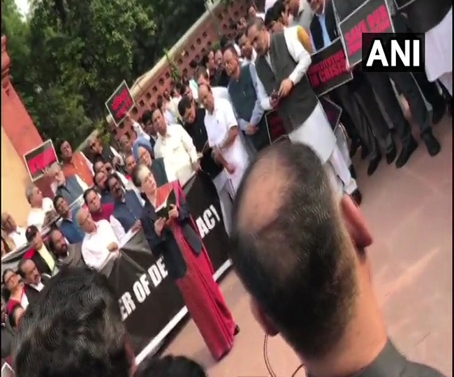 11:22 am: Delhi: Leaders of Opposition parties, including Congress' Sonia Gandhi, former PM & Congress leader Manmohan Singh and Shiv Sena's Arvind Sawant, hold a protest in front of the Ambedkar Statue in Parliament.