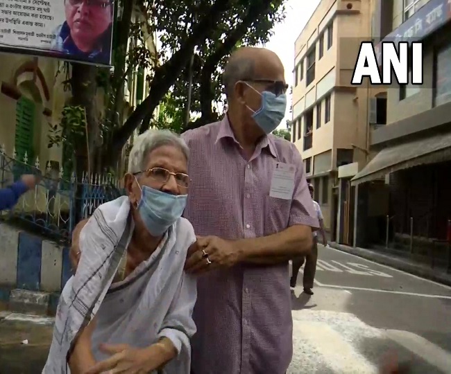 9:07 hours: 90-year-old Manobashini Chakrabarty casts her vote at Mitra Institution polling booth in Bhabanipur.