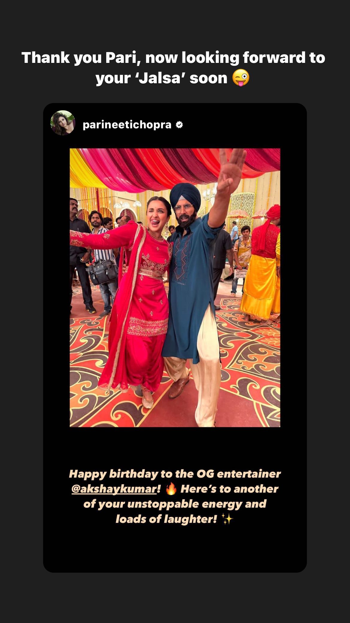 The 'Khiladi' reposted her story and wrote, "Thank you Pari, now looking forward to your ‘Jalsa’ soon (winking face with tongue emoji)."