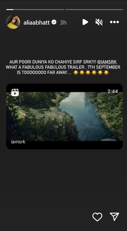 Praising the trailer and reacting to her reference in the video, Alia wrote, "Aur poori duniya ko chahiye sirf SRK!!..."What a fabulous fabulous trailer. 7th September is toooooo far away".