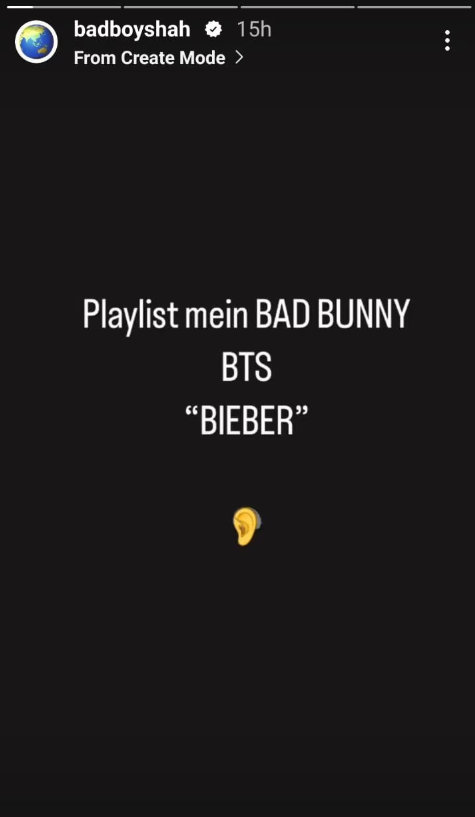 On Friday, rapper Badshah addressed the issue through his Instagram Stories. He posted, "Playlist mein BAD BUNNY BTS 'BIEBER' (ear with hearing aid emoji)." The mention of Bieber refers to the singer Justin Bieber.