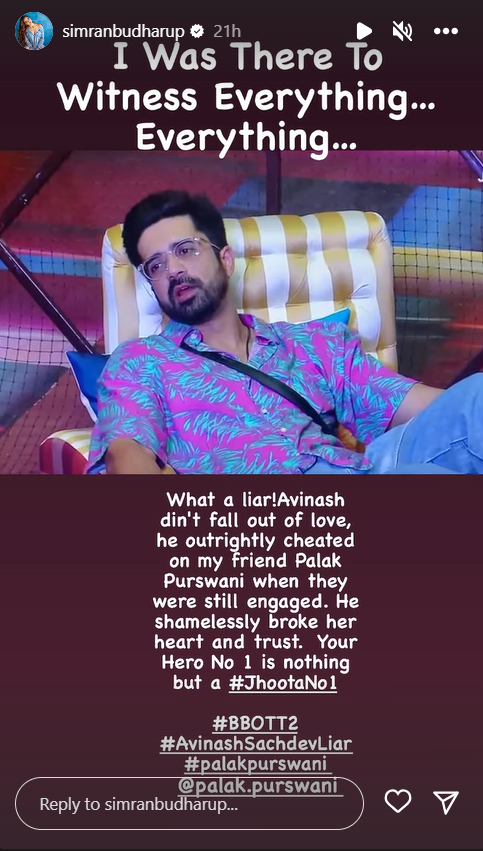 Now, Palak Purswani's friend and actor Simran Budharup took to her Instagram and slammed Avinash Sachdev calling him a liar in her new social media post. After divorcing his ex-wife Shalmalee, Avinash Sachdev started dating Palak Purswani, and the duo got engaged, but in 2020 the two broke up.
