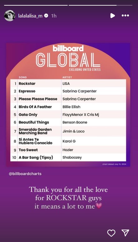Lisa shared this news on Instagram and wrote, "Thank you for all the love for ROCKSTAR guys. It means a lot to me."
