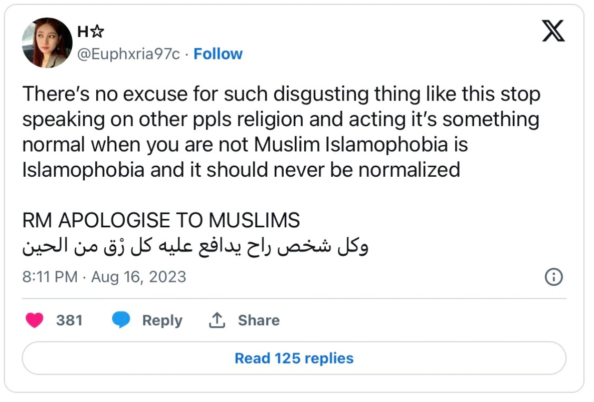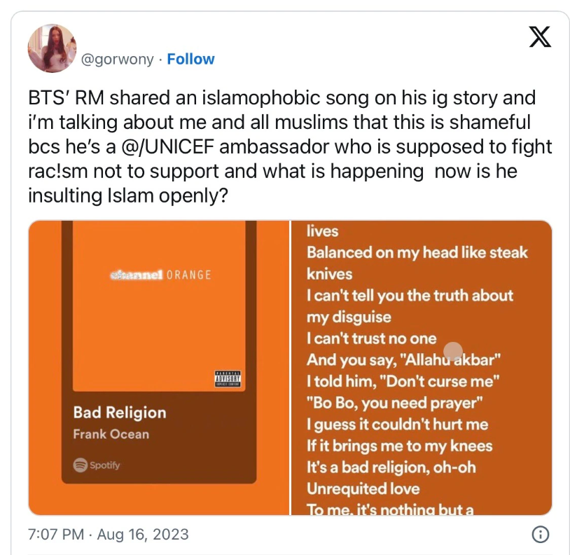 Amid various interpretations of the lyrics, a significant number of social media users expressed their displeasure with RM sharing the song, raising questions about whether he intended to offend sentiments by doing so.