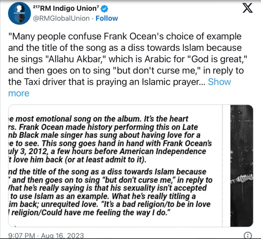 Interpreting the lyrics, it appears that Frank Ocean is drawing a comparison between unrequited love and 'bad religion,' but this viewpoint has led to divided opinions among some fans.