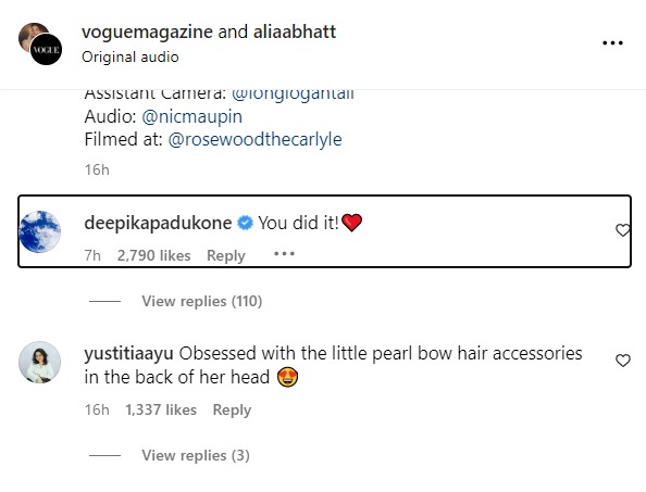 Now, reacting to Alia Bhatt's Instagram post, Deepika Padukone took to the comments section and wrote, "You did it," adding a red heart emoticon to it.