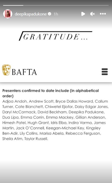 Deepika Padukone has established herself as a global star and is now all set to attend the BAFTA 2024 award ceremony. The actress will be one of the presenters at this prestigious ceremony and confirmed the news on her Instagram story. She will David Beckham, Dua Lipa, Cate Blanchett, Andrew Scott, and Lily Collins at the BAFTA, which will be held at Royal Festival Hall in London on February 18.