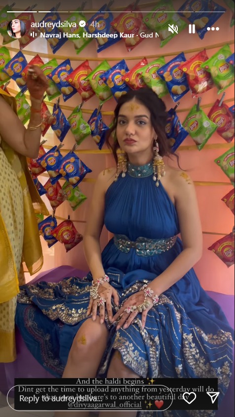 Divya Agarwal's intimate haldi ceremony was shared by her friend Audrey Dsilva on Instagram. Instead of the usual yellow attire, Divya donned a stylish navy blue indo-western outfit, catching everyone's attention. The unique setting for the ritual was against a wall adorned with chips and snack packets, adding a quirky touch to the festivities.