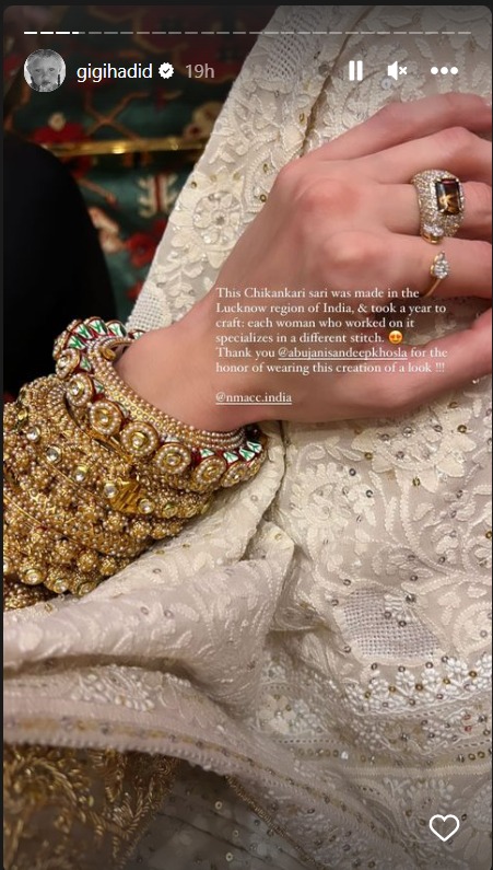 Lauding the NMACC Gala, Gigi Hadid took to her Instagram handle and wrote, "The @nmacc.india Gala was a celebration of Indian craftsmanship, and its inspiration on fashion internationally, with the opening of the exhibit “India in Fashion: The Impact of Indian Dress and Textiles on the Fashionable Imagination,” curated by the iconic @hamishbowles!"
