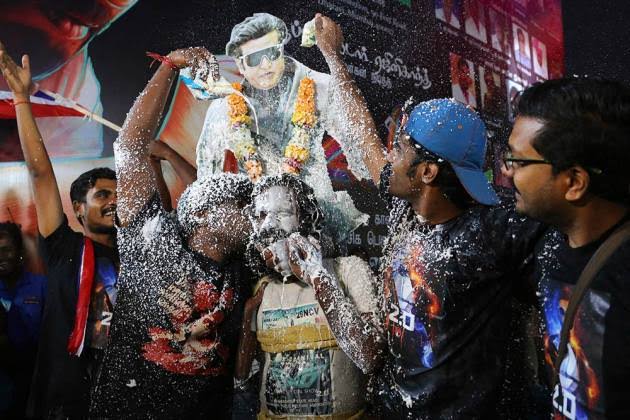 #WATCH | Tamil Nadu | Fans offer milk to superstar Rajinikanth's poster, celebrate outside theatres across Chennai, on the release of his film 'Jailer' pic.twitter.com/c1z4bSmJRR