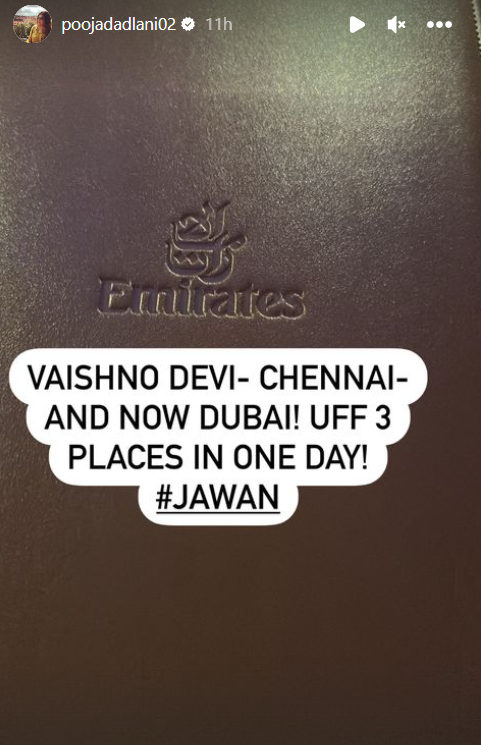 Shah Rukh Khan’s manager Pooja Dadlani, updated her fans with the team’s soon-to-be presence in Dubai. Sharing a booklet from the airline on Instagram, she wrote, “Vaishno Devi-Chennai and now Dubai. Uff 3 places in one day! #Jawan.”