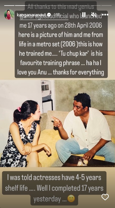 Kangana Ranaut recently recalled how filmmaker Anurag Basu trained her for Life In Metro. Sharing an old photograph, she wrote on her Instagram Stories, "All thanks to this mad genius @anuragbasuofficial who launched me 17 years ago on 28th April 2006 here is a picture of him and me from life in a metro set (2006) this is how he trained me.... 'Tu chup kar (You keep quiet)' is his favourite training phrase...ha ha I love you Anu...thanks for everything." She also added, "I was told actresses have 4-5 years shelf life... Well, I completed 17 years yesterday... (slightly smiling face emoji)."