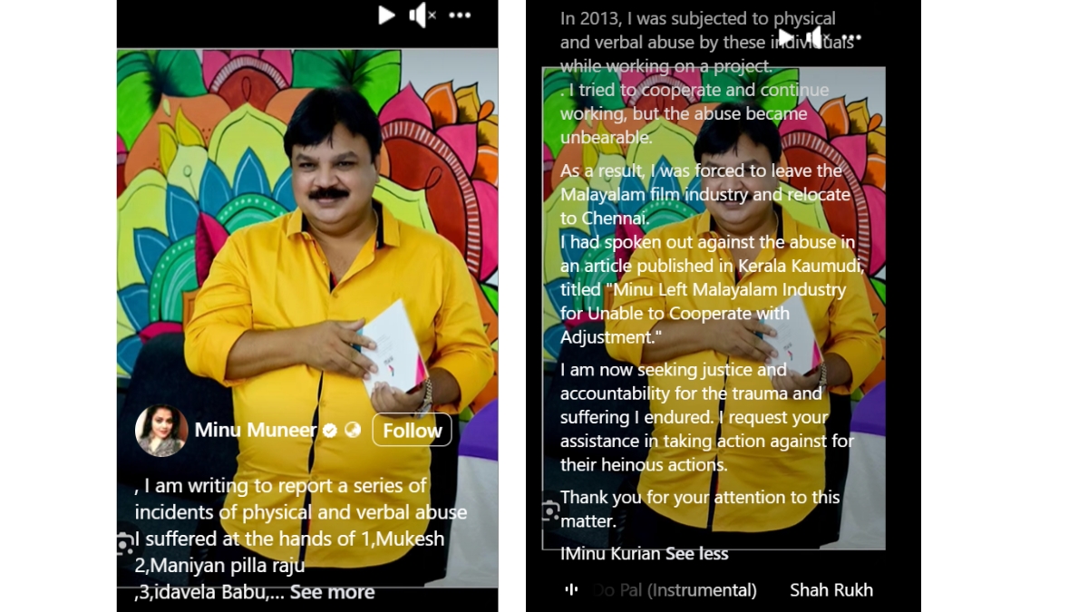 Minu Muneer wrote on Facebook, "I am writing to report a series of incidents of physical and verbal abuse I suffered at the hands of Mukesh, Maniyanpilla Raju, Idavela Babu, Jayasurya, Advocate Chandrasekharan, production controller Noble and Vichu, in the Malayalam film industry. In 2013, I was subjected to physical and verbal abuse by these individuals while working on a project. I tried to cooperate and continue working, but the abuse became unbearable. As a result, I was forced to leave the Malayalam film industry and relocate to Chennai. I had spoken out against the abuse in a newspaper article. I am now seeking justice and accountability for the trauma and suffering I endured. I request your assistance in taking action against them for their heinous actions."