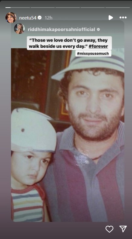 Riddhima posted her childhood pictures with Rishi Kapoor on her Instagram story and wrote, "Those we love don't go away, they walk beside us every day. #forver #missyousomuch."