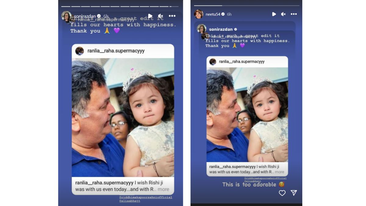 Sharing the picture on her Instagram story, Soni Razdan wrote, "This is such a great edit. It fills our hearts with happiness. Thank you (folded hands and purple emojis)." Neetu Kapoor reposted Soni Razdan's story and wrote, "This is too adorable."