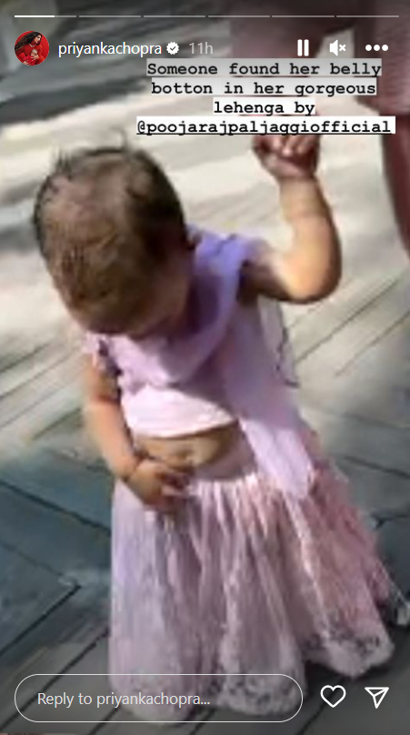 In her Instagram post, Priyanka Chopra shared a picture of Malti, who was walking while holding someone's hand. Along with the photo, Priyanka wrote, "Someone found her belly button in her gorgeous lehenga by @poojarajpaljaggiofficial." The image depicted Malti wearing an adorable light purple lace lehenga and a top with straps, along with a small dupatta elegantly draped around her neck.