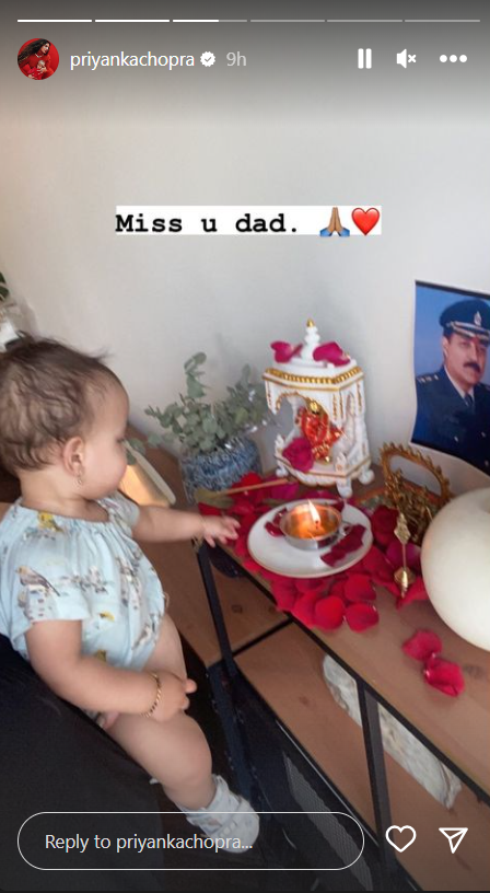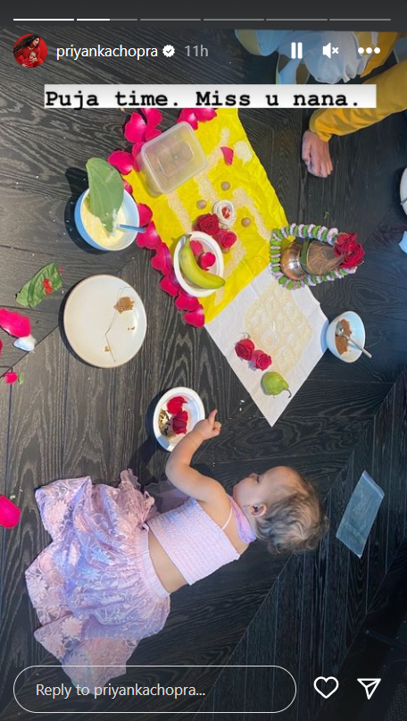 In a subsequent image, Malti was captured collecting flowers from the ground following the pooja. Priyanka expressed her sentiment in the accompanying caption, stating, "Puja time, miss you Nana."