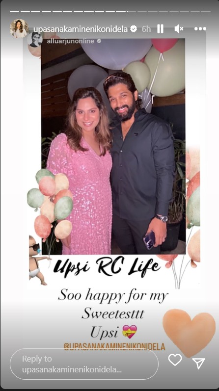 Sharing a picture with the mom-to-be on his Instagram Stories, Allu Arjun wrote, "Soo happy for my Sweetesttt Upsi @Upasanakaminenikonidela (sic)." In the picture, the duo could be seen simply posing in front of the camera. While Allu Arjun looked dapper in a black outfit, Upasana opted for a pink-coloured dress.