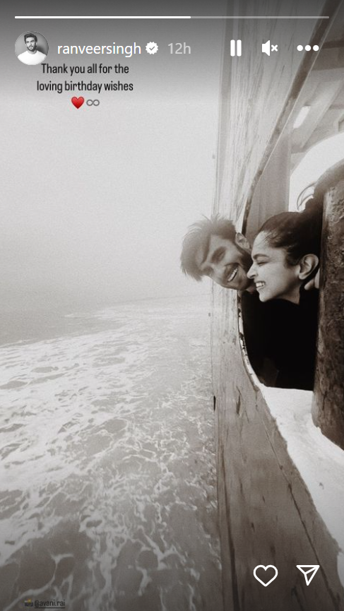 Ranveer Singh expressed his gratitude to his fans and well-wishers for the birthday greetings he received. In the photo he shared, Ranveer and Deepika Padukone can be seen seated on a ship, leaning outwards. Deepika, with her eyes closed, wears a smile on her face, while Ranveer, sitting beside her, looks towards the camera with a joyful laugh.
