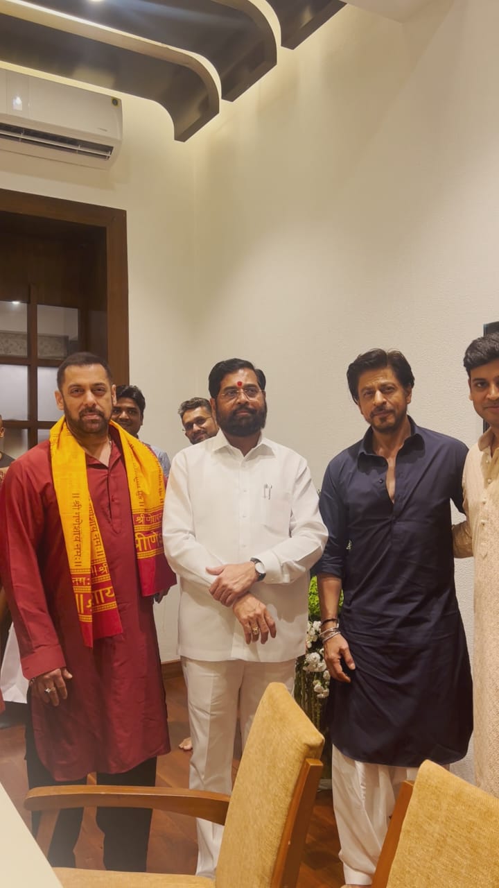 Bollywood biggies Shah Rukh Khan and Salman Khan marked their presence together at Maharashtra Chief Minister Eknath Shinde’s residence in Mumbai. The two attended the Ganpati puja organised by the political figure on Sunday night, September 24. The duo were seen striking a pose with the Chief Minister and shared warm greetings in front of the camera. Several pictures and videos surfaced on the internet capturing the duo’s presence together, which is now the new talk of the town.