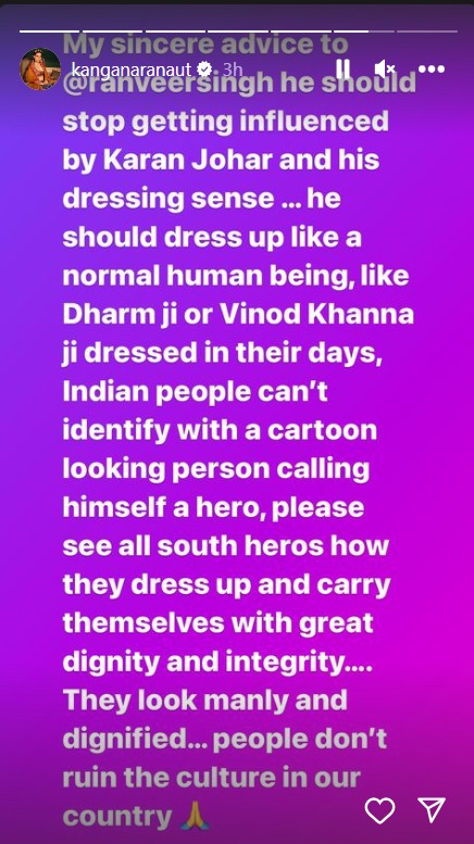 Not only this, she further called Ranveer Singh ‘cartoon looking person’ and wrote, “My sincere advice to @ranveersingh he should stop getting influenced by Karan Johar and his dressing sense … he should dress up like a normal human being, like Dharm ji (Dharmendra) or Vinod Khanna ji dressed in their days, Indian people can't identify with a cartoon looking person calling himself a hero, please see all south heroes how they dress up and carry themselves with great dignity and integrity….. They look manly and dignified… people don't ruin the culture in our country (join hands emoji).”