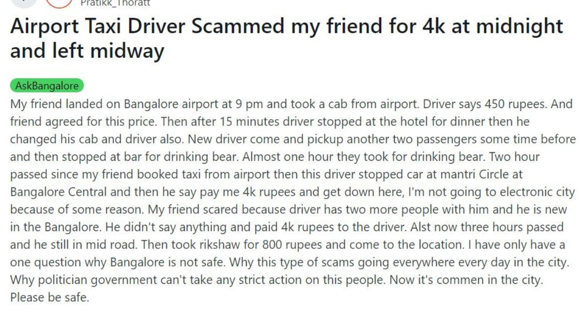 Raising concerns about the safety of those new to Karnataka’s capital Bengaluru, a man recently took to the social media platform Reddit and claimed that an airport taxi driver scammed his friend, who was new to the city, of Rs 4,000 at midnight and left him midway. The IT Hub has been making headlines for a while now for such incidents.