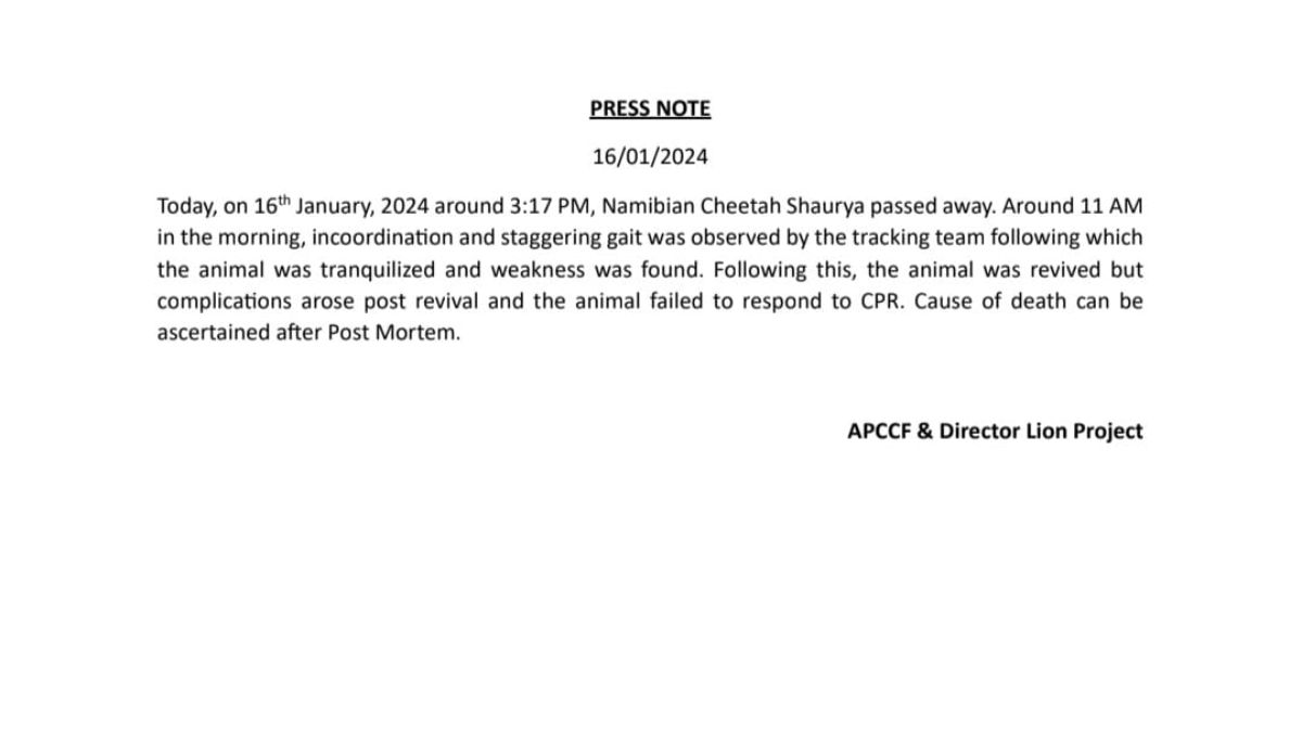 "Today, on 16th January 2024 around 3:17 PM, Namibian Cheetah Shaurya passed away. Around 11 AM, incoordination and staggering gait were observed by the tracking team following which the animal was tranquilized and weakness was found. Following this, the animal was revived but complications arose post-revival and the animal failed to respond to CPR. Cause of death can be ascertained after post-mortem," APCCF & Director Lion Project said in the statement.