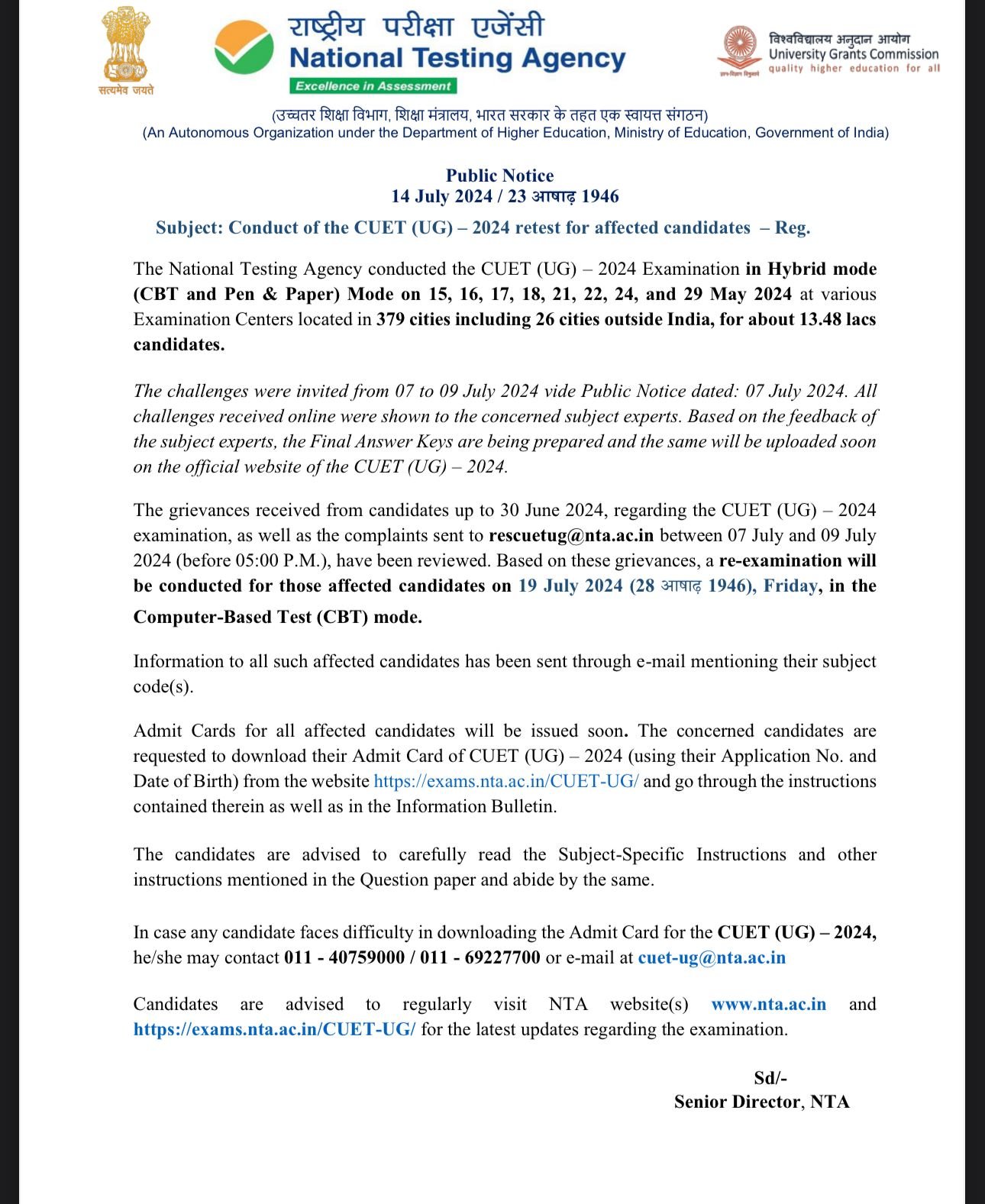 "Based on these grievances, a re-examination will be conducted for those affected candidates on July 19, 2024, in the Computer-Based Test (CBT) mode," the notification said.