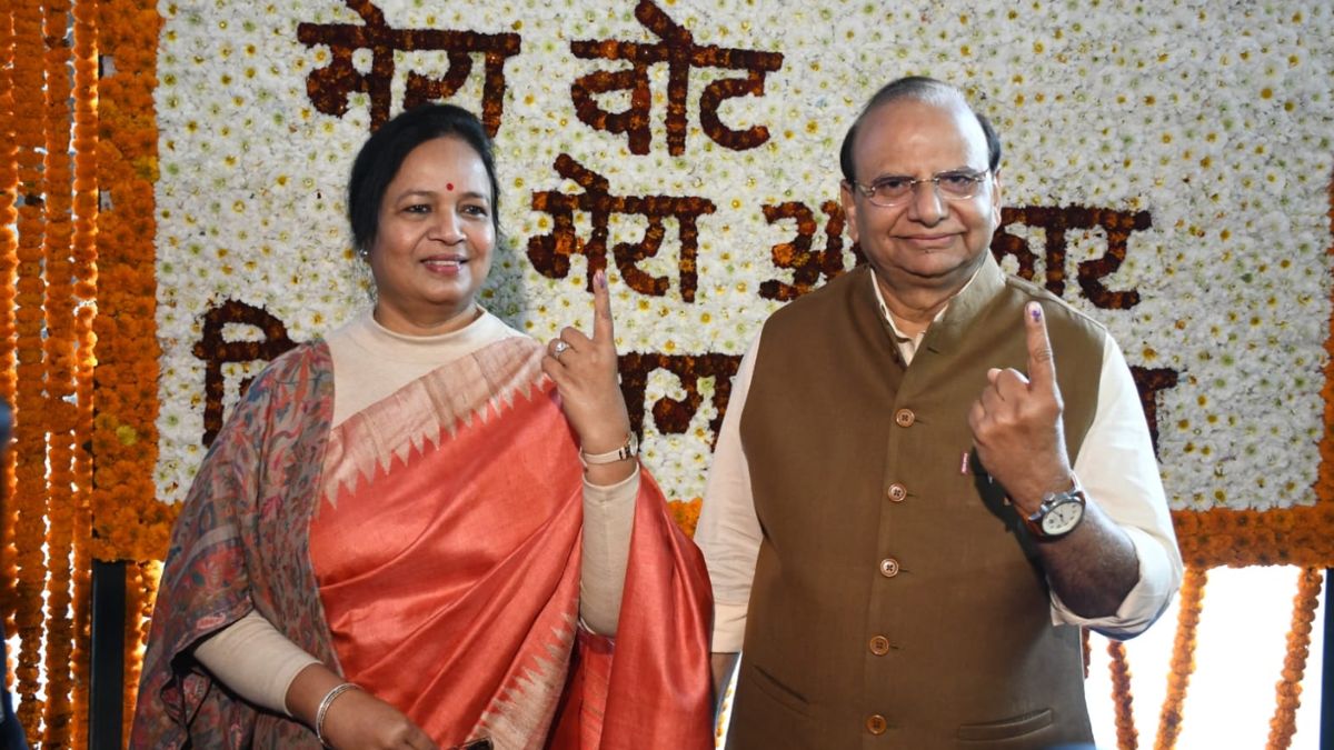 After casting his vote at Raj Niwas Marg's St. Xavier's School, Lt. Governor VK Saxena showed the ink mark on his finger, with his wife by his side. (Photo-Dhruv Kumar)